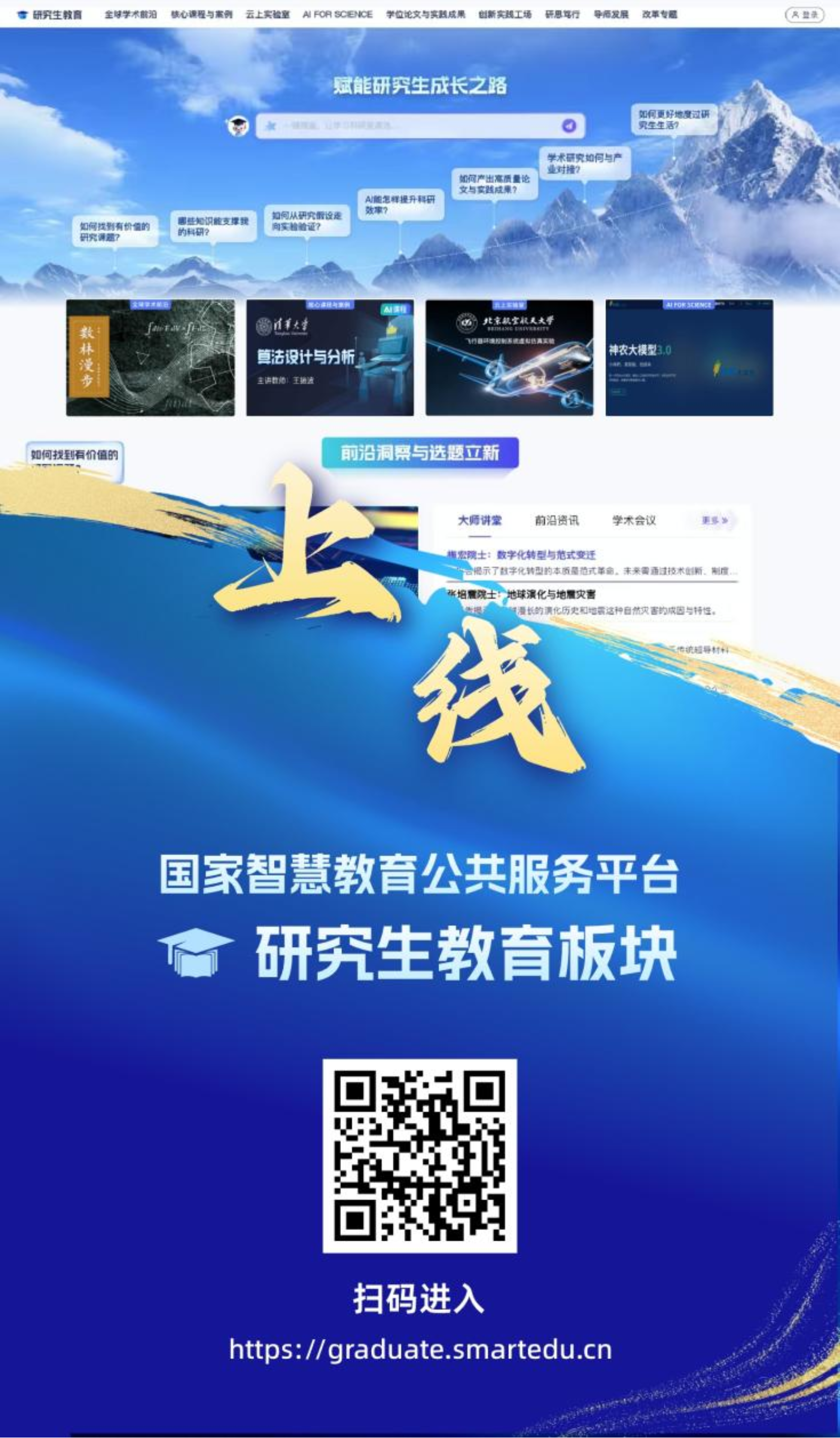 全新设计板块架构,设立全球学术前沿、核心课程与案例、云上实验室、AI for Science、学位论文与实践成果、创新实践工场、研思笃行、导师发展八大服务模块,专门开设卓越工程师培养、科技小院、申请学位实践成果三个改革专栏,全面覆盖学生成长与导师育人全场景。
