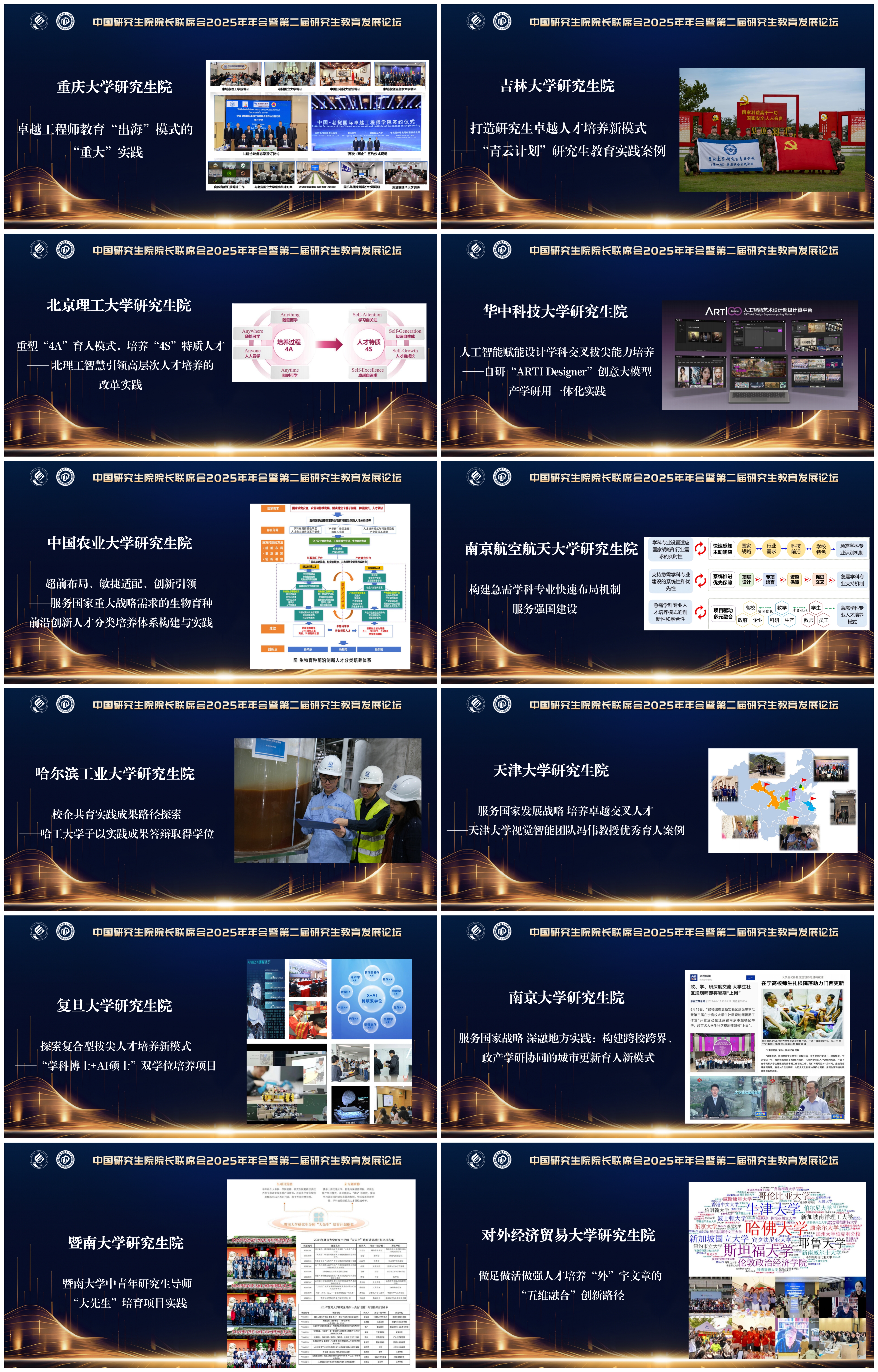 重庆大学研究生院报送的《卓越工程师教育“出海”模式的“重大”实践》、吉林大学研究生院报送的《打造研究生卓越人才培养新模式——“青云计划”研究生教育实践案例》、北京理工大学研究生院报送的《重塑“4A”育人模式,培养“4S”特质人才——北理工智慧引领高层次人才培养的改革实践》、华中科技大学研究生院报送的《人工智能赋能设计学科交叉拔尖能力培养——自研“ARTI Designer”创意大模型产学研用一体化实践》、中国农业大学研究生院报送的《超前布局、敏捷适配、创新引领——服务国家重大战略需求的生物育种前沿创新人才分类培养体系构建与实践》、南京航空航天大学研究生院报送的《构建急需学科专业快速布局机制,服务强国建设》、哈尔滨工业大学研究生院报送的《校企共育实践成果路径探索——哈工大学子以实践成果答辩取得学位》、天津大学研究生院报送的《服务国家发展战略 培养卓越交叉人才——天津大学视觉智能团队冯伟教授优秀育人案例》、复旦大学研究生院报送的《探索复合型拔尖人才培养新模式——“学科博士+AI硕士”双学位培养项目》、南京大学研究生院报送的《服务国家战略 深融地方实践:构建跨校跨界、政产学研协同的城市更新育人新模式》、暨南大学研究生院报送的《暨南大学中青年研究生导师“大先生”培育项目实践》和对外经济贸易大学研究生院报送的《做足做活做强人才培养“外”字文章的“五维融合”创新路径》获“案例成就奖”。