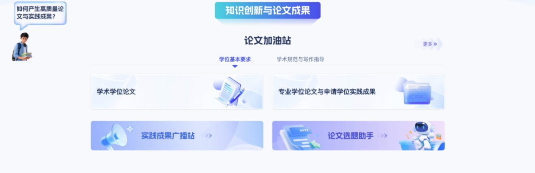围绕学位论文与申请学位实践成果提供专业化支持服务。系统汇聚政策文件、写作课程、选题库及优秀范例等关键资源。
