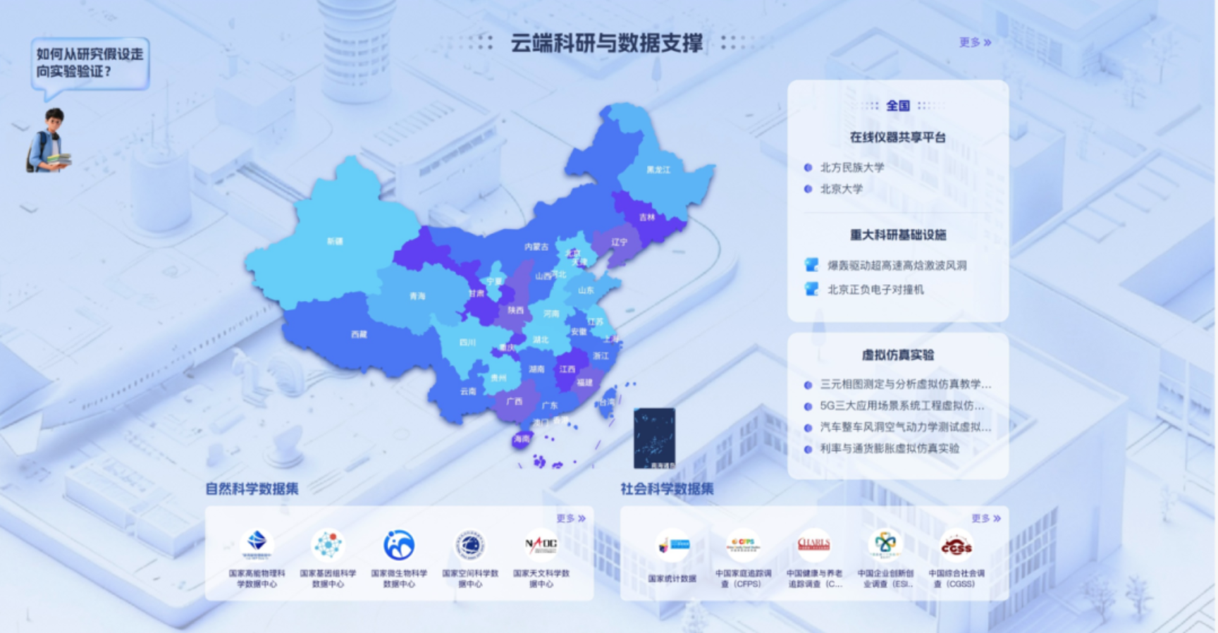 构建云端科研环境,推动科研资源开放共享。接入多学科数据集60万余个,汇集全国重大科研设施、仪器平台及虚拟仿真实验资源。