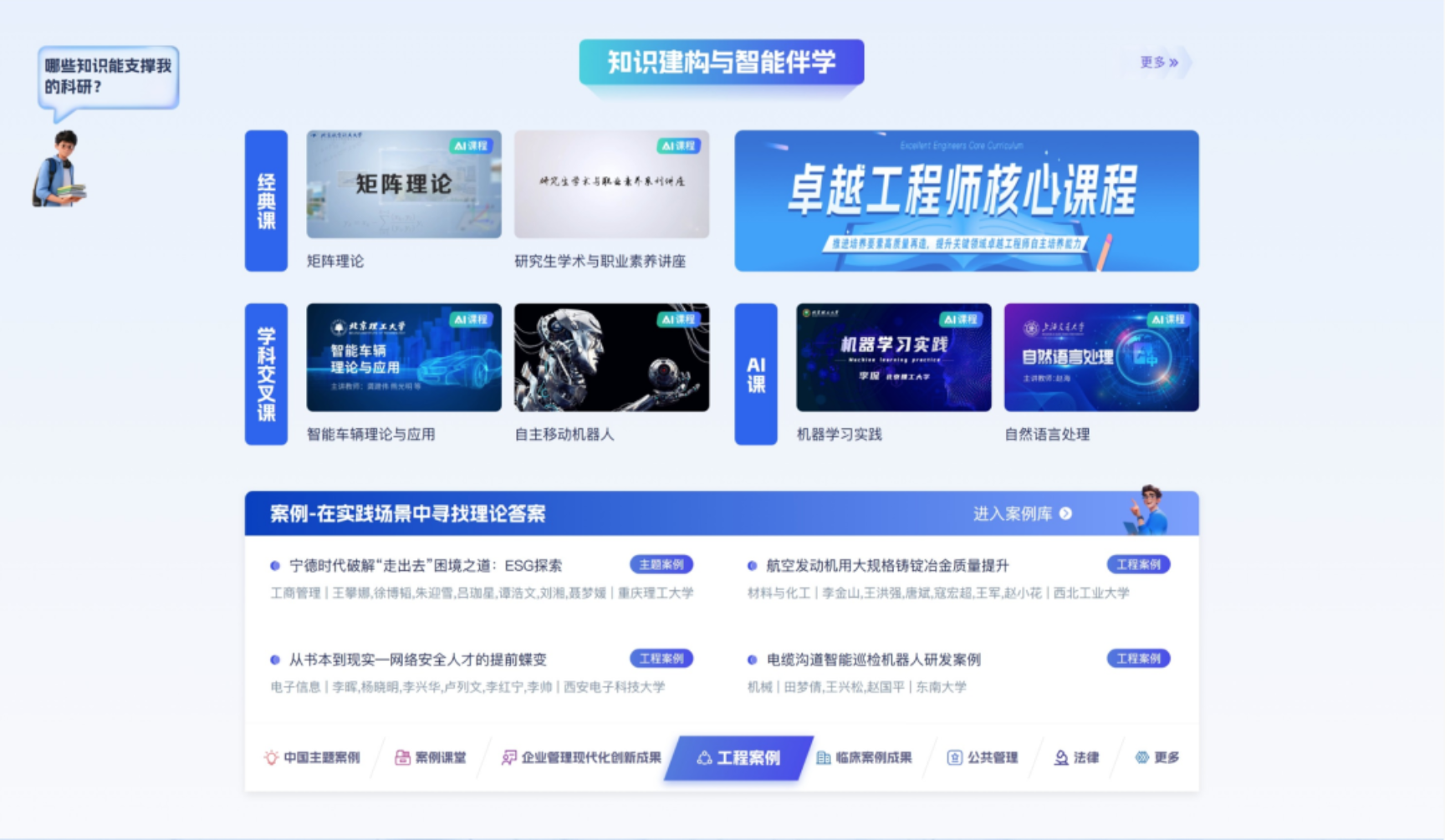 构建覆盖多学科的课程与案例资源体系。汇聚高校2300余门优质在线课程(含经典课、学科交叉课、AI课等),整合各专业学位类别教学案例2.4万余个。