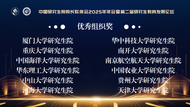 经会员单位自荐、秘书处初选和专家“背靠背”函评评审,12所研究生院和12个案例分获“优秀组织奖”和“案例成就奖”,评选结果于2025年10月25日在中国研究生院院长联席会2025年年会暨第二届研究生教育发展论坛闭幕式揭晓。