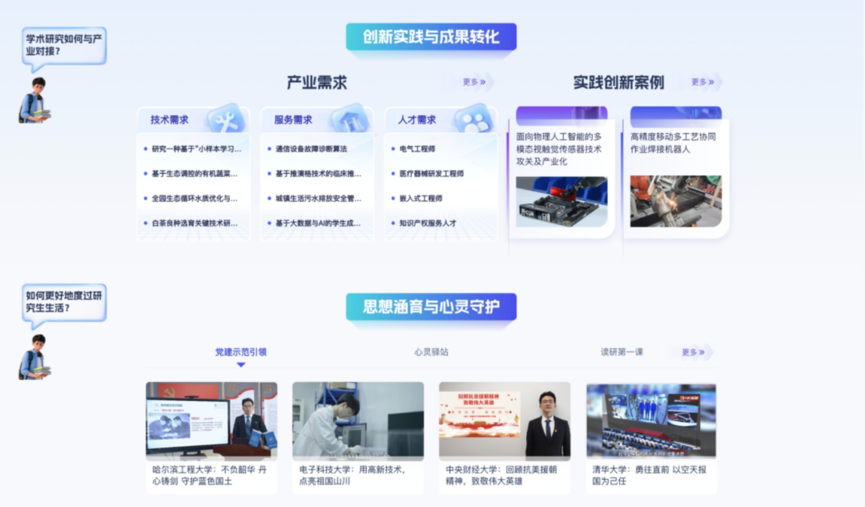 突出对研究生的价值引领、人文关怀与心理支持。集中提供研究生微党课、党建小微案例、科研报国典型事迹、心理健康课程与指南等核心资源。